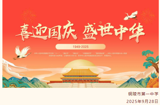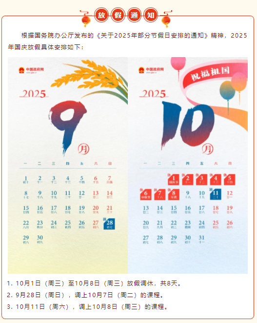 金秋送爽,家国同庆。2025年10月1日,我们将迎来中华人民共和国76周年华诞,恰逢中秋佳节如约而至,国之庆典与家之团圆在此刻深情相拥。为让孩子们在双节假期中感受家国情怀、体验团圆之乐,同时度过一段安全充实的时光,现将学校国庆中秋放假安排及相关注意事项告知您,请配合做好孩子的假期监护与教育工作。