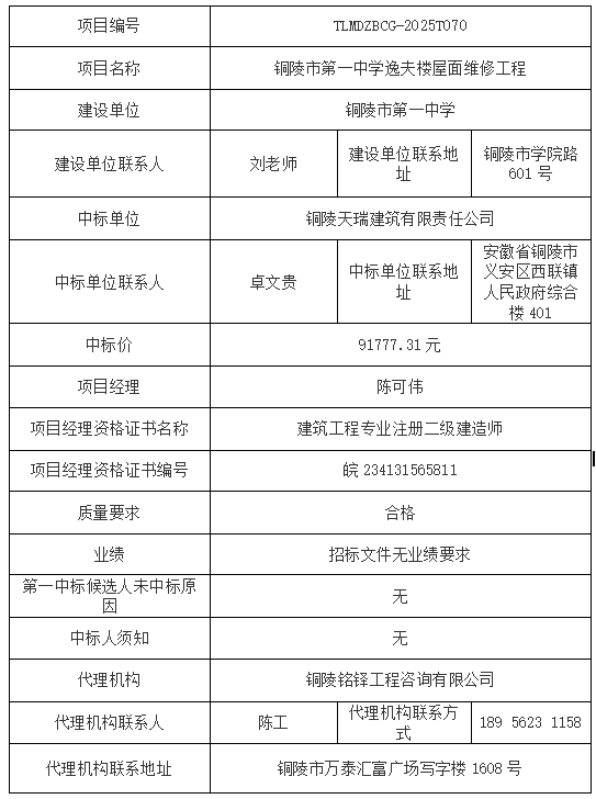 铜陵市第一中学逸夫楼屋面维修工程中标结果公示