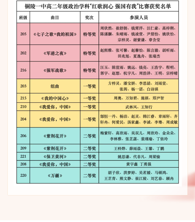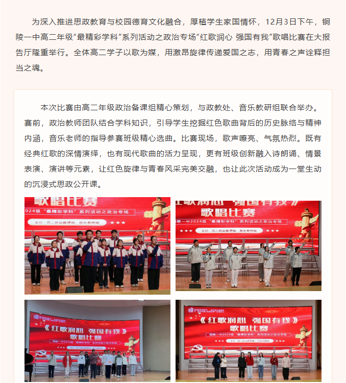 最精彩学科 | 铜陵一中高二年级政治学科“红歌润心 强国有我”比赛圆满落幕