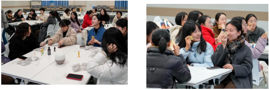 在肖医生的专业指导下,女教职工们手持刮痧板,蘸取精油相互协助定位穴位、练习按摩技法。按压与精油的淡雅香气交织,让原本略显专业的养生知识变得通俗易懂、可感可及。现场氛围热烈而温馨,这种‘理论+实操+体验’的形式让女教职工们边练习、边交流、边记录,在互动分享中收获健康技能,在彼此陪伴中释放心理压力。