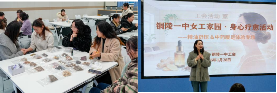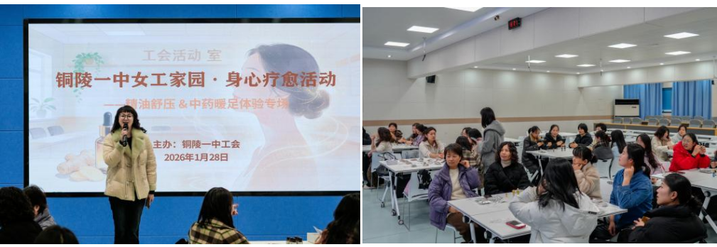 为深入践行校工会“以人为本、关爱职工”的核心宗旨,切实守护女教职工身心健康,缓解其在教学科研与家庭生活中面临的双重压力,1月28日下午四点,铜陵市第一中学工会女工家园在教研活动室精心策划了一场集专业性、实用性与体验感于一体的身心疗愈专场活动。活动特邀铜陵市第二人民医院中医科肖医生担任主讲,近女60名女教职工齐聚一堂,在中医智慧与精油疗愈的中,解锁健康守护新方式,感受校园大家庭的温暖关怀。