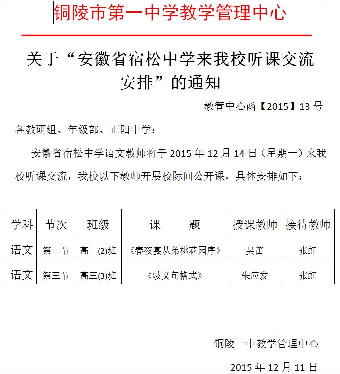 关于“安徽省宿松中学来我校听课交流安排”的通知