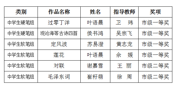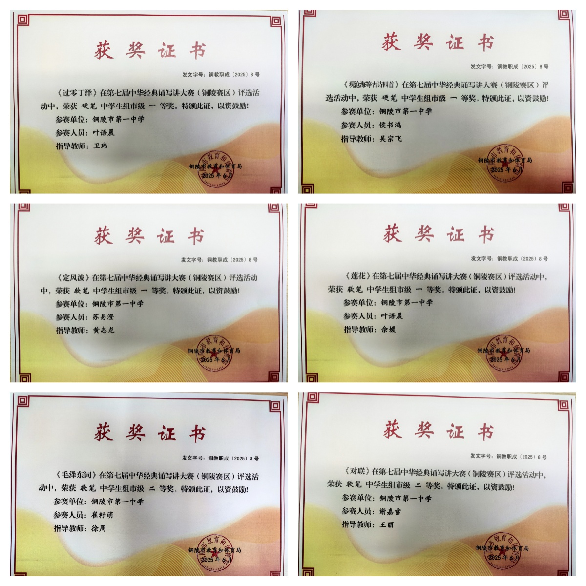 日前,根据《安徽省教育厅关于组织参加第七届中华经典诵写讲大赛的通知》(皖教秘语〔2025〕4号)要求,市教育和体育局组织开展了第七届中华经典诵写讲大赛汉字书写比赛铜陵赛区选拔。校政教处积极组织实施,认真遴选报送优秀作品参加比赛,取得不菲成绩。经专家评审,我校叶语晨、候书鸿两位同学获得中学组硬笔书法一等奖,苏易澄、叶语晨两位同学获得中学组软笔书法一等奖,谢嘉雪、崔籽萌两位同学获得中学组软笔书法二等奖。在此向以上同学表示热烈祝贺!