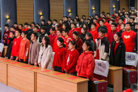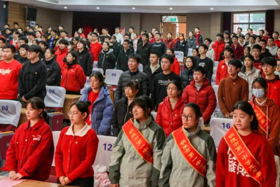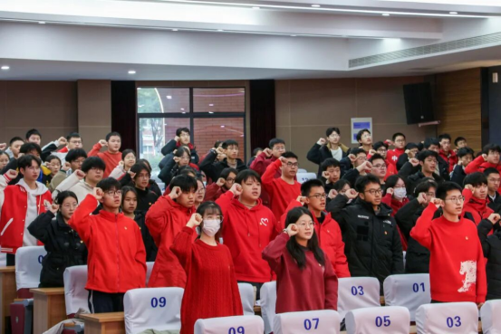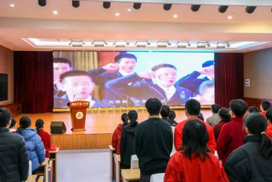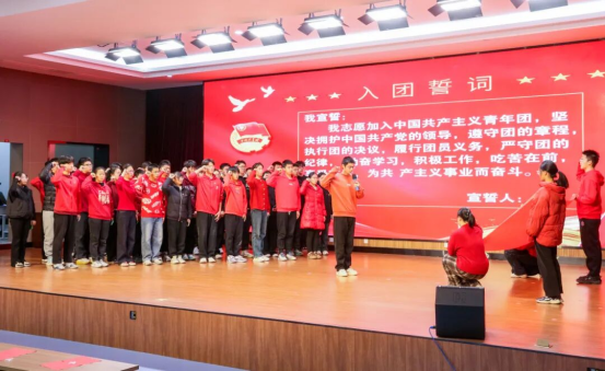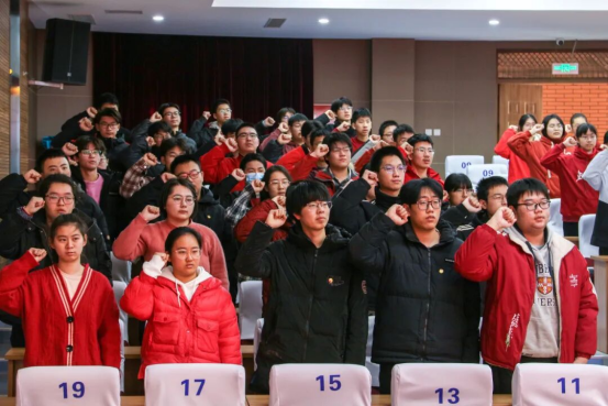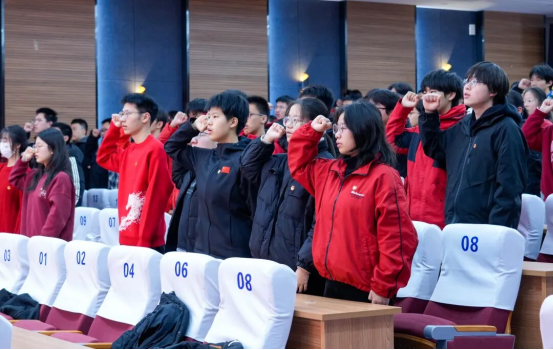 在203班团支书毕宸浩同学的带领下,全体新团员面向团旗庄严宣誓。“我志愿加入中国共产主义青年团……”铮铮誓言在报告厅内回荡,同学们喊出的是他们坚定跟党走、奋进新时代的力量与决心。
