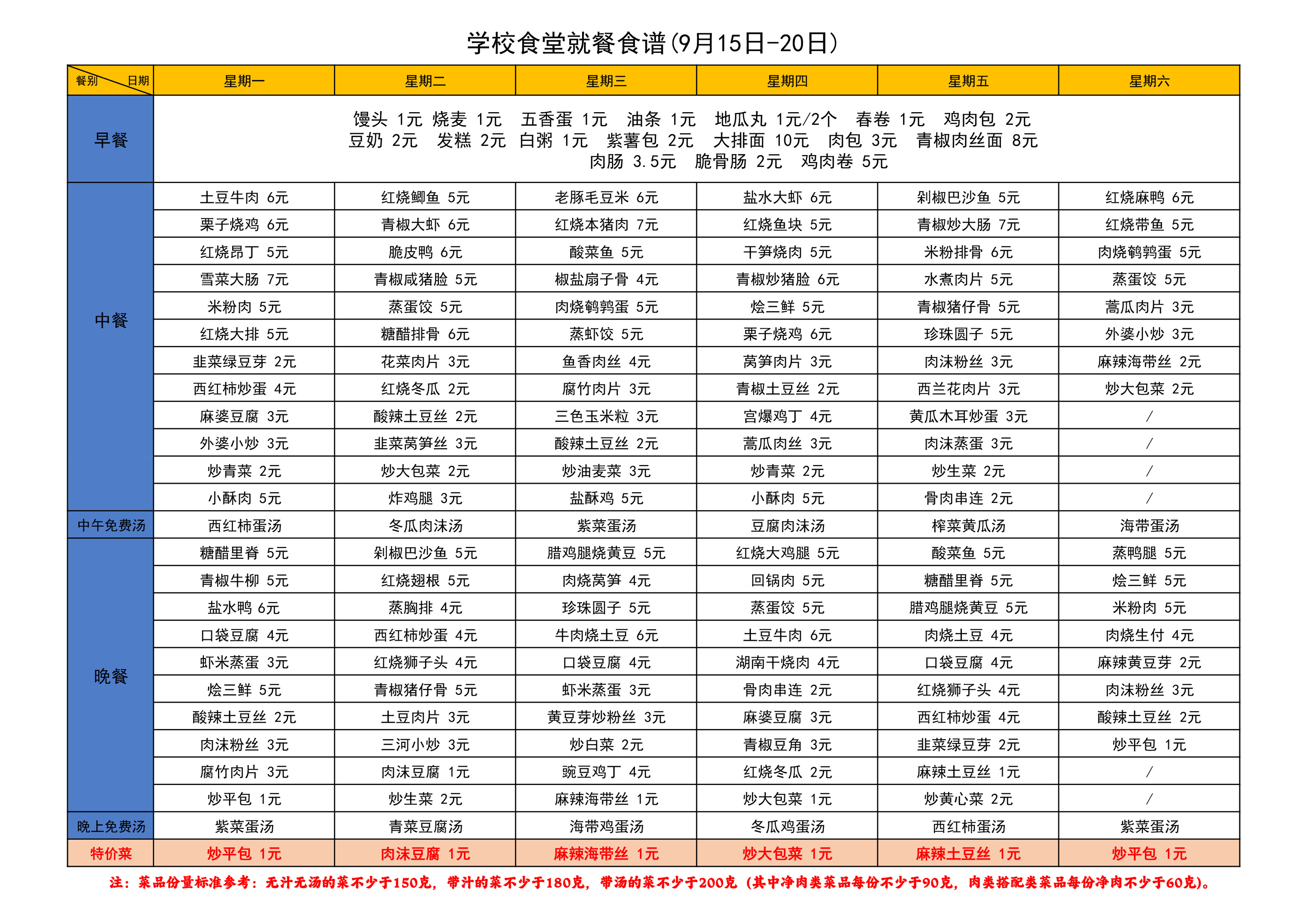 学校食堂就餐食谱(9月15日-20日)