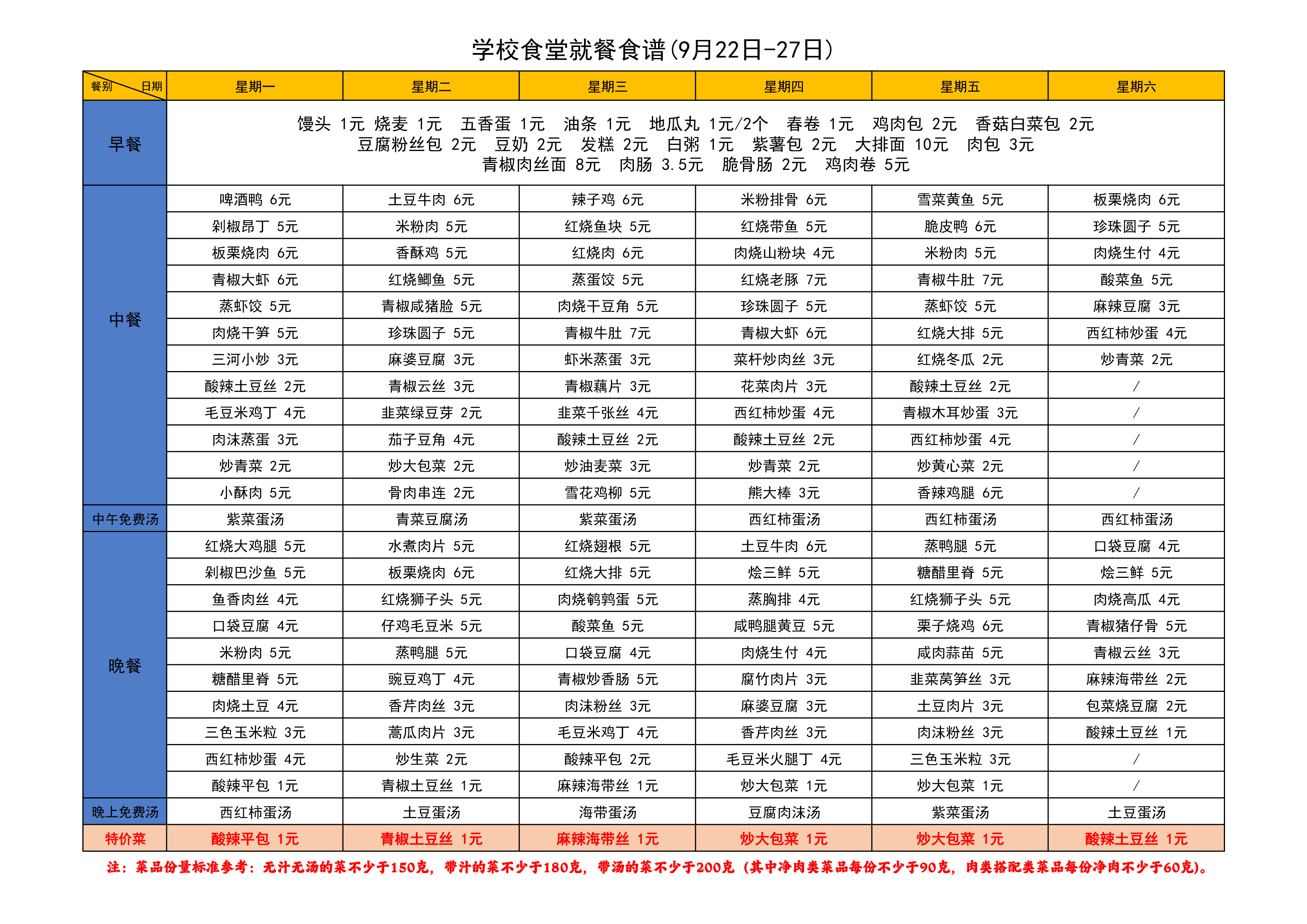 学校食堂就餐食谱(9月22日-27日)