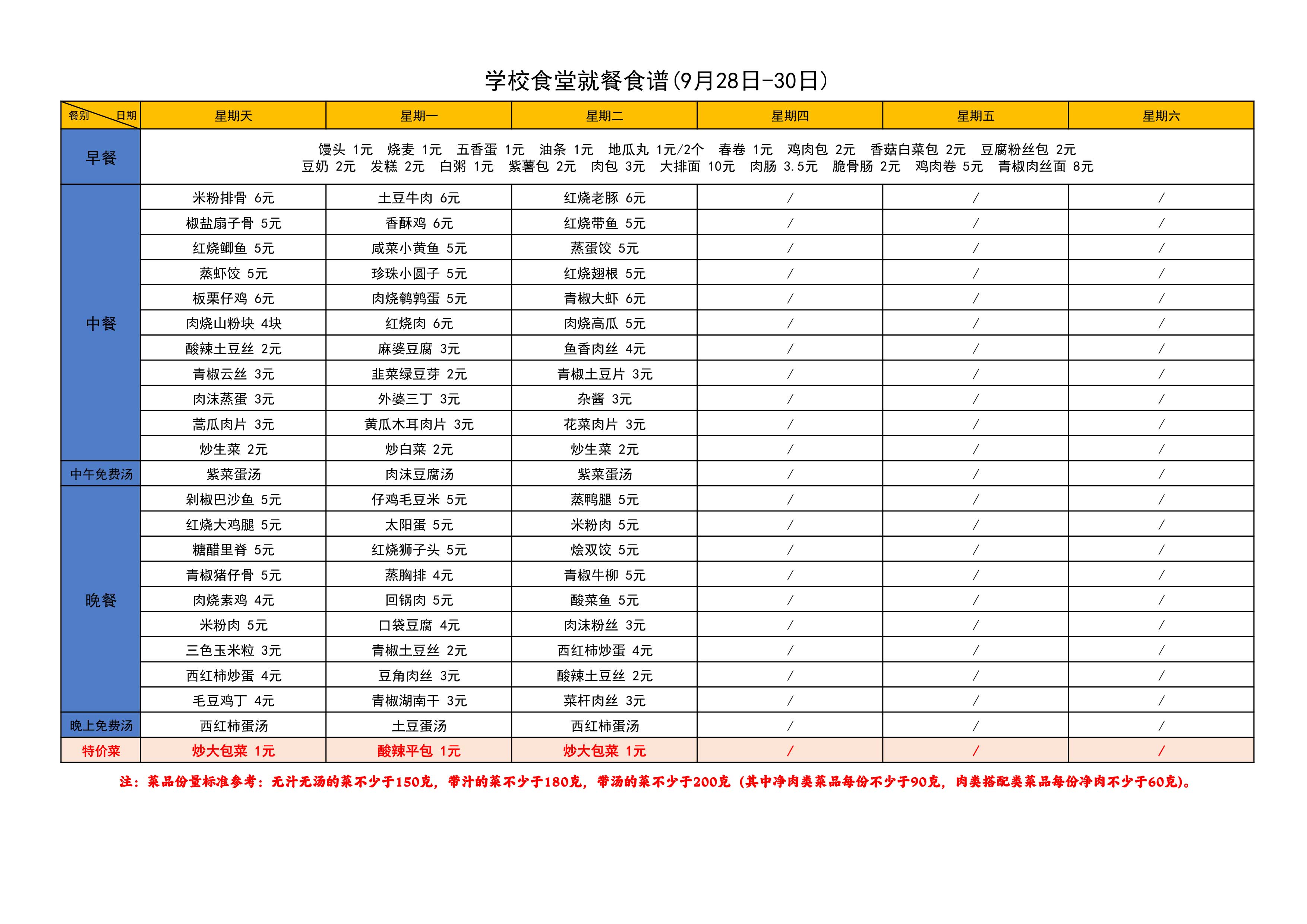 学校食堂就餐食谱(9月28日-30日)