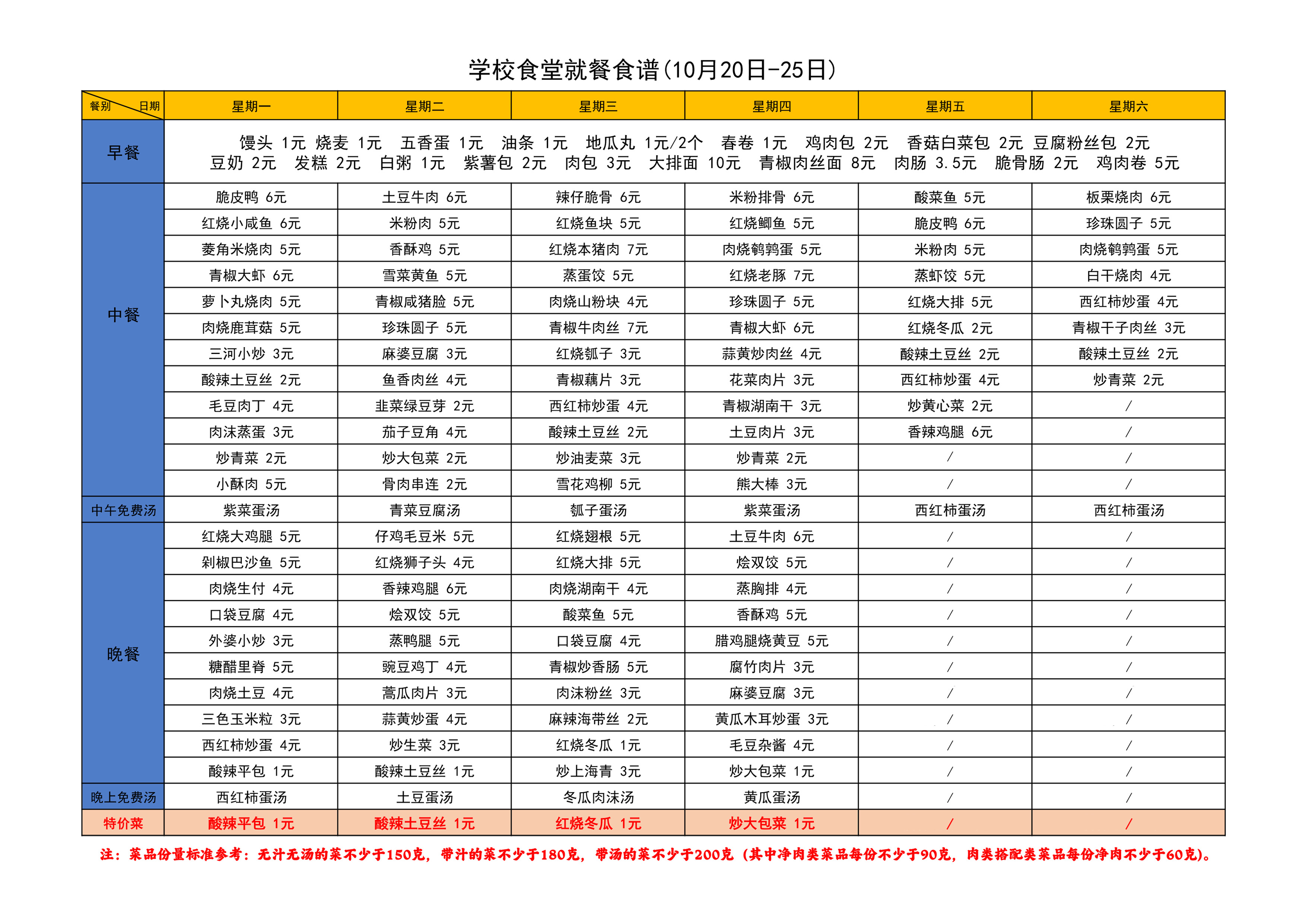学校食堂就餐食谱(10月20日-25日)