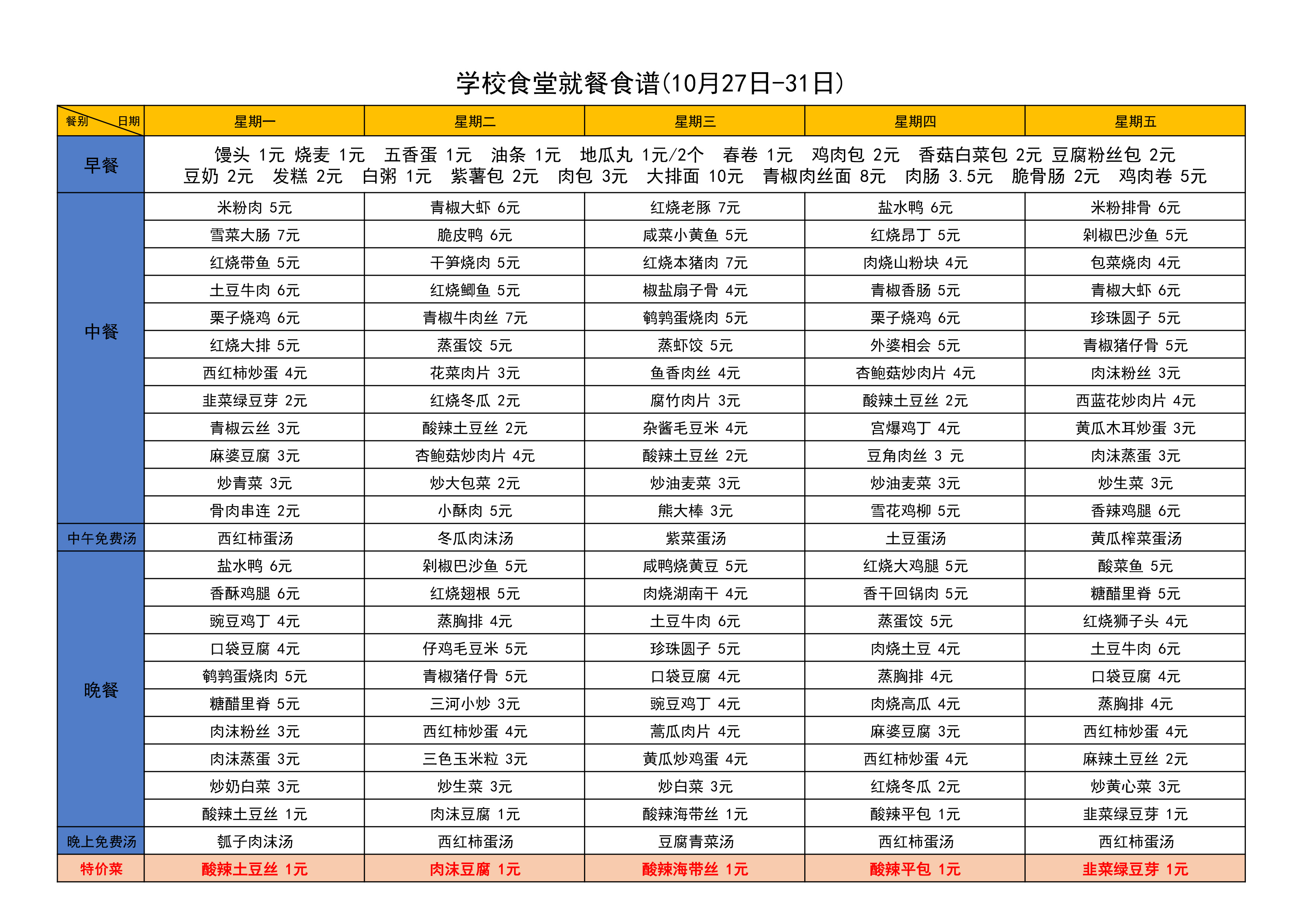 学校食堂就餐食谱(10月27日-31日)