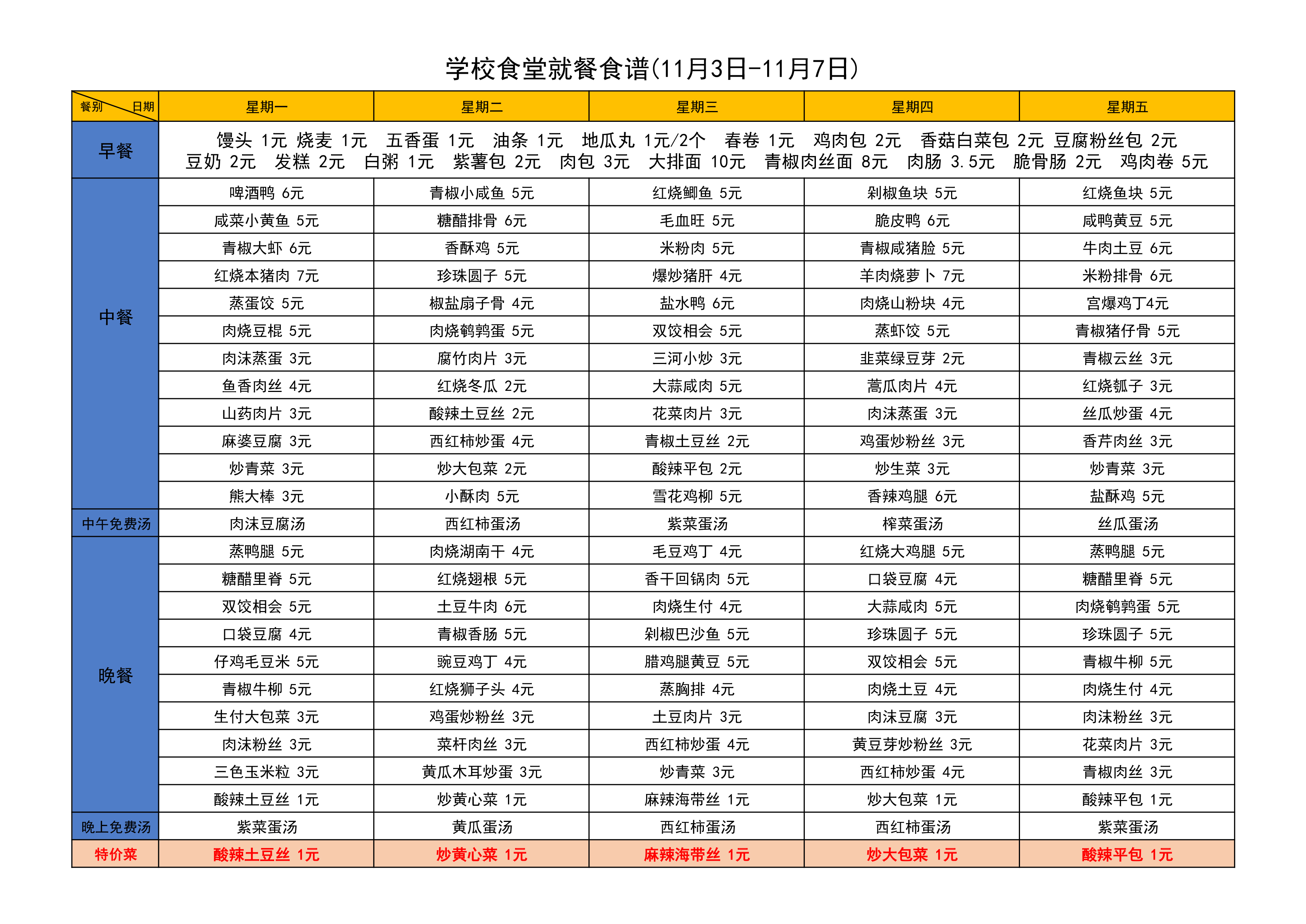 学校食堂就餐食谱(11月3日-11月7日)