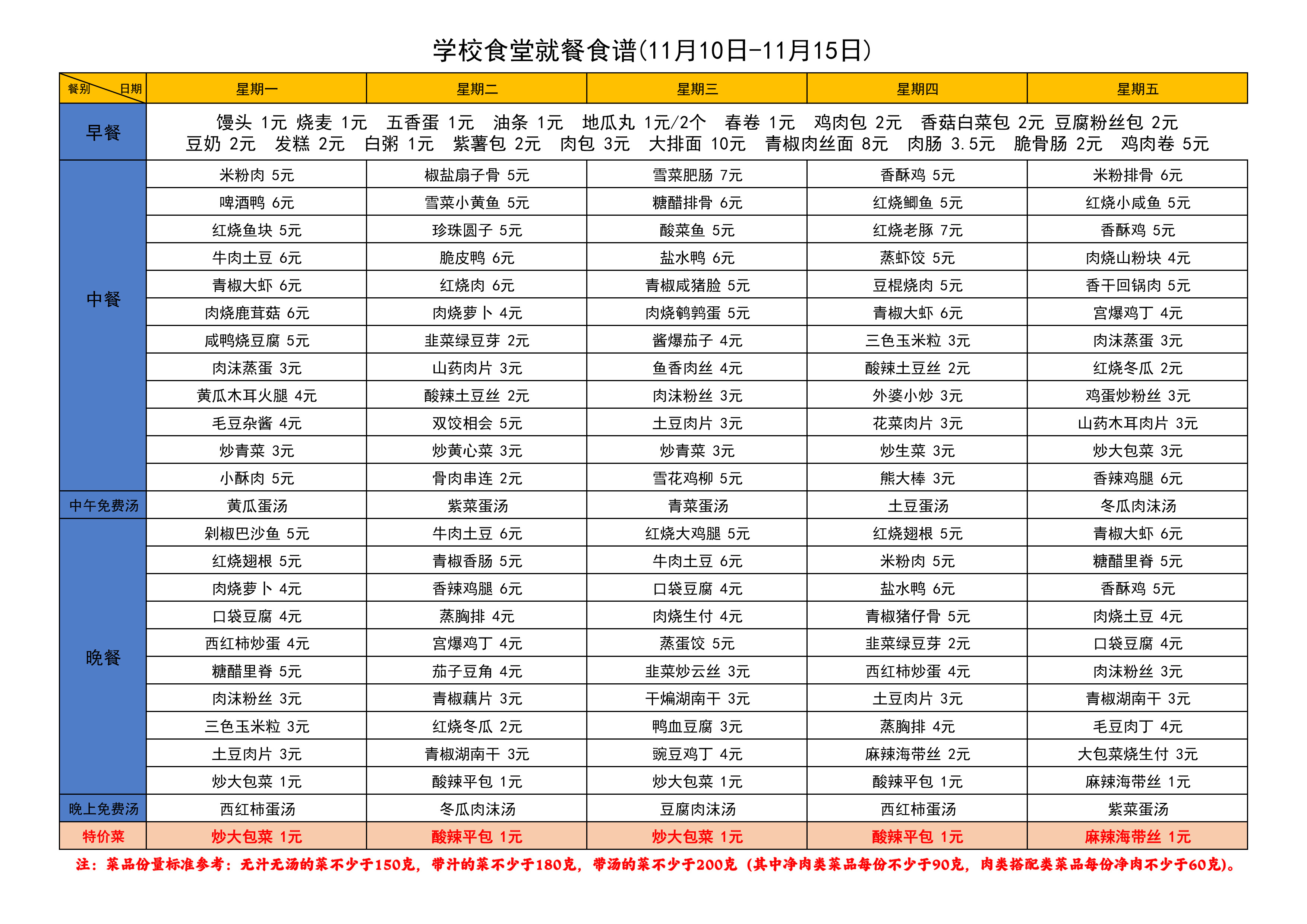 学校食堂就餐食谱(11月10日-11月15日)
