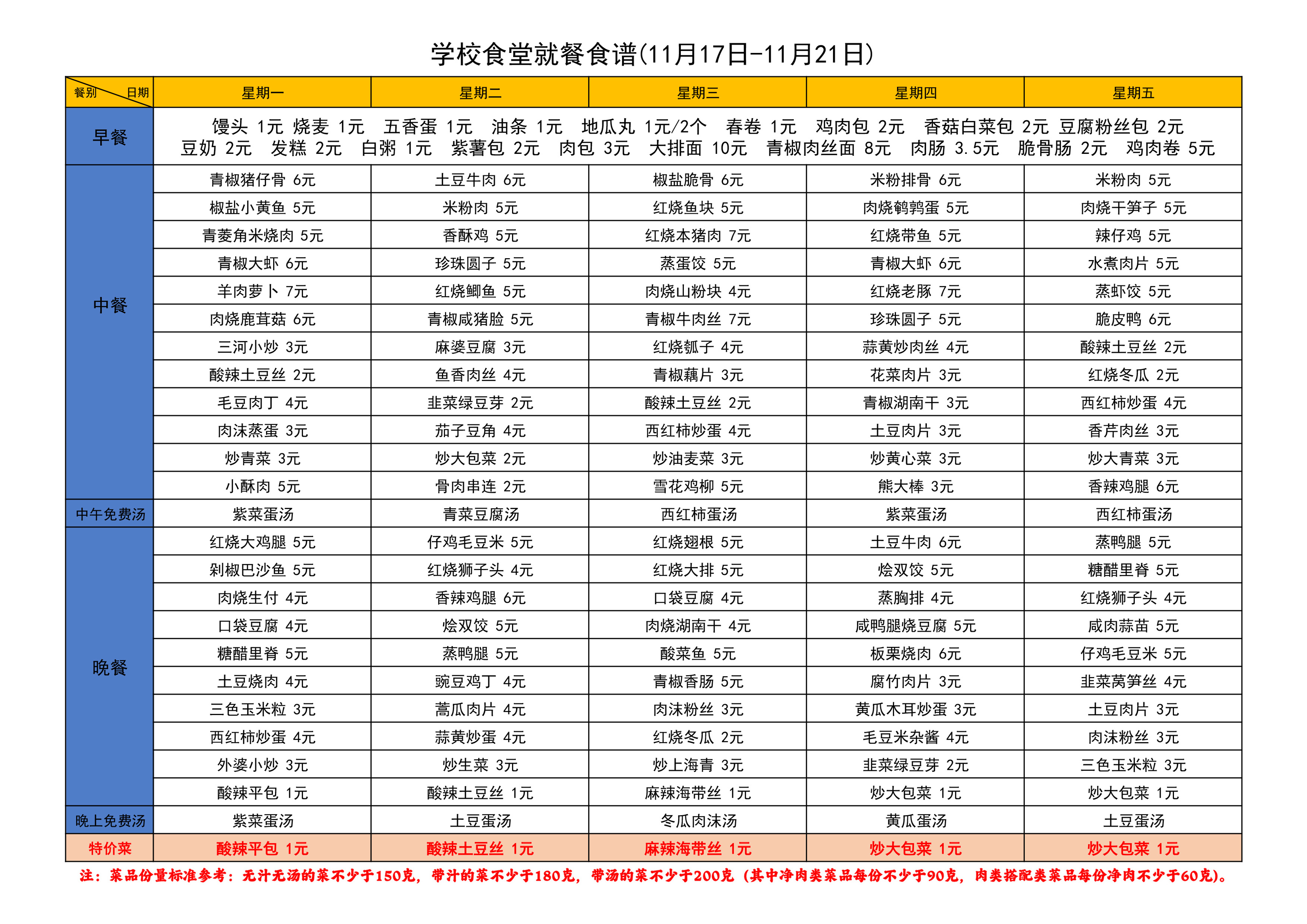 学校食堂就餐食谱(11月17日-11月21日)