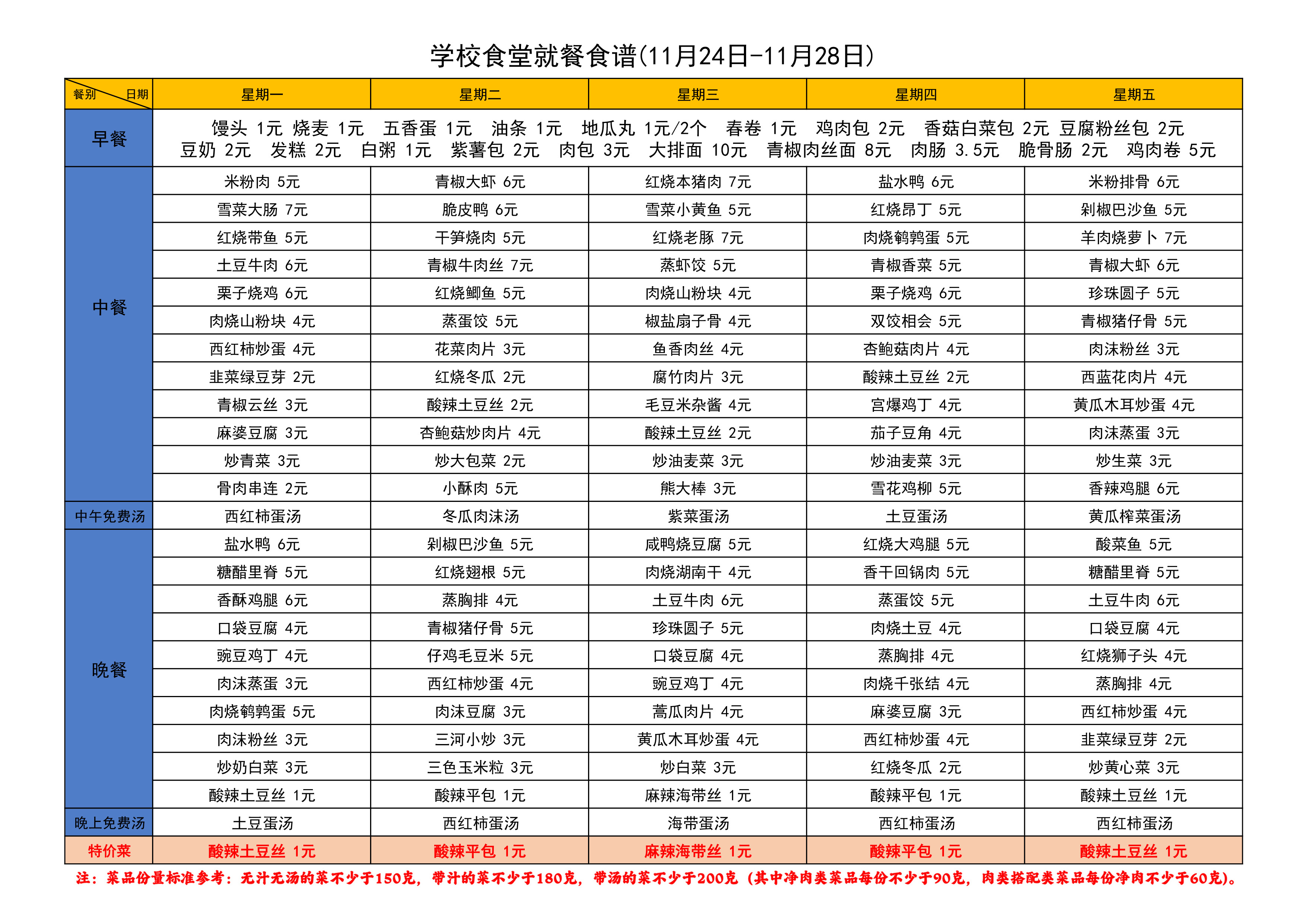 学校食堂就餐食谱(11月24日-28日)