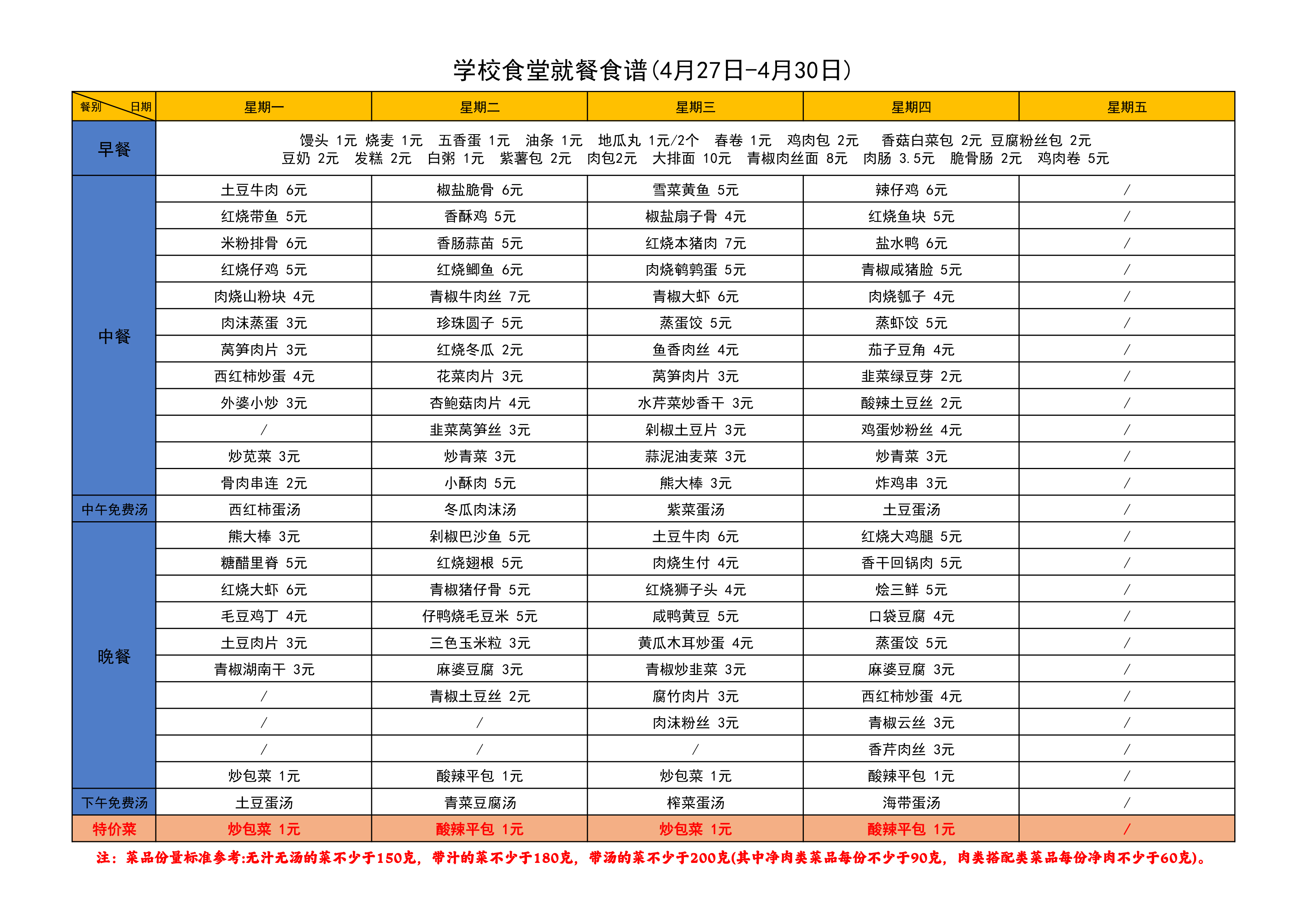 学校食堂就餐食谱(4月20-4月24日)