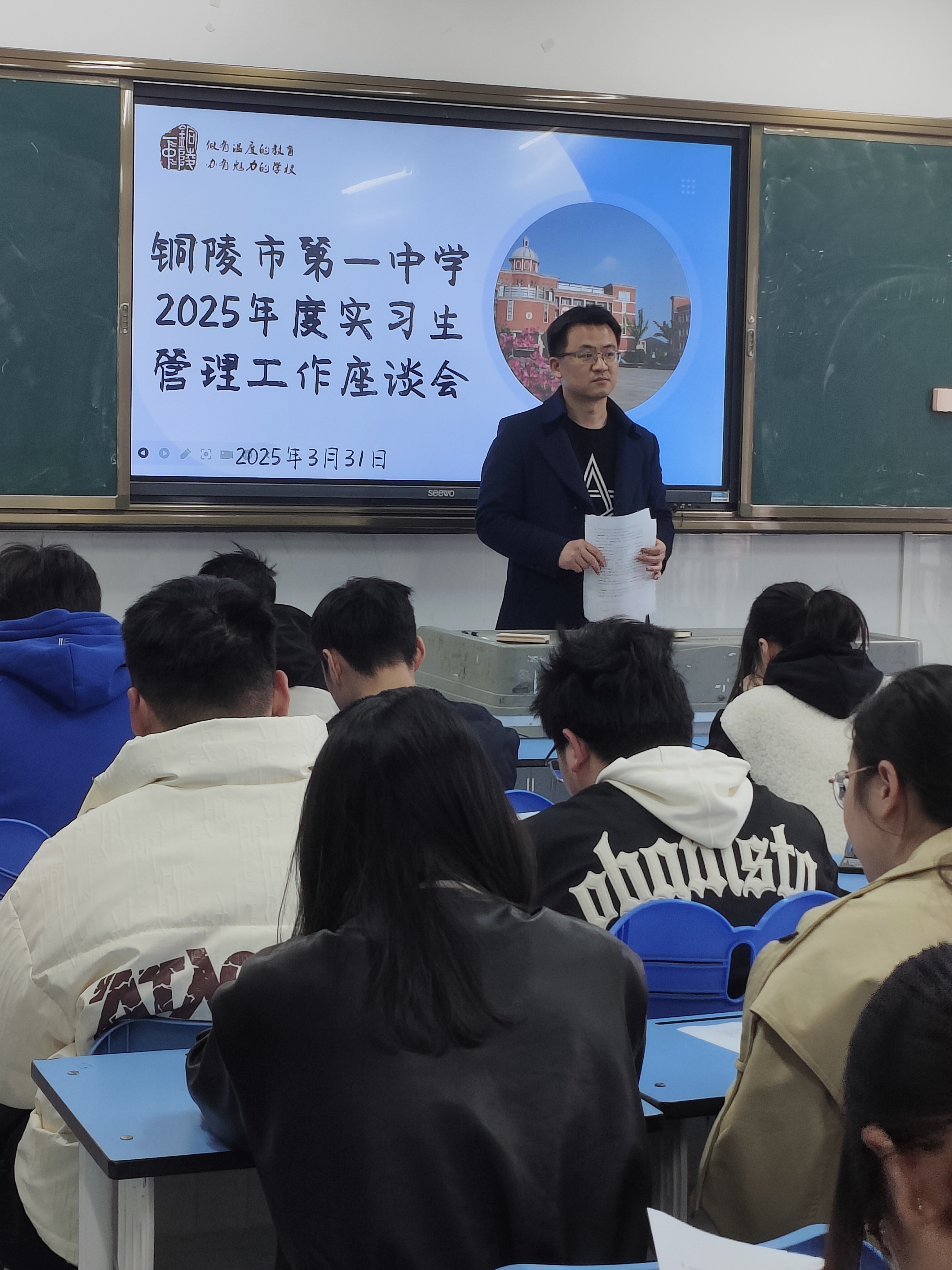 为切实了解安徽师范大学实习生在我校的工作与生活情况,帮助其更好地适应实习环境,3月31日下午我校在辅礽图书馆三楼走班教室11召开2025年度实习生管理工作座谈会。会议由教科室负责人杨平主持,来自安徽师范大学的44位实习生参加会议。