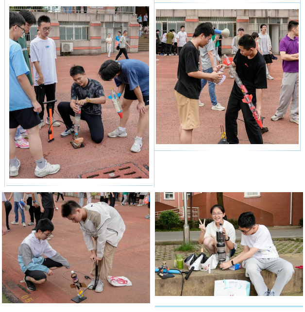 水火箭制作是本次比赛的核心环节。参赛队伍需利用废弃饮料瓶、硬纸板等环保材料,结合物理课正在学的“反冲原理”与“空气动力学”知识,自主设计火箭箭体、尾翼和发射装置。在物理组各位老师的指导下,各班学生积极踊跃尝试,从发射基座到火箭造型再到助力设备,充分体现了当代中学生的创造力和想象力。