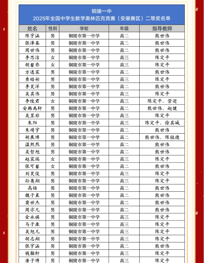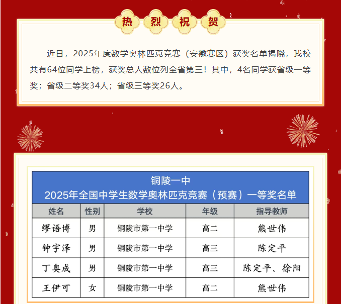 全省第三 | 数学奥赛64人获省级奖,其中4人获省一!