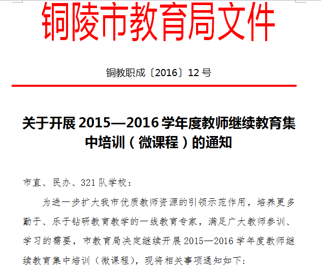 接铜教职成〔2016〕12号《关于开展2015—2016学年度教师继续教育集中培训(微课程)的通知》