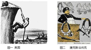 | 10.五月卷第21题:以下是美国和捷克斯洛伐克分别于1947年和1949年以马歇尔计划(Marshall Plan)为对象创作的漫画。(注:图一人物身上的文字是Europe,绳子上写着Marshall Plan;图二人物手中和墙上挂着的绳圈上分别写着法国、德国等国家名称),下列对漫画解读正确 A.马歇尔计划主要目的是帮助欧洲经济复兴 B.马歇尔计划的实施导致了东、西欧对立的加剧 C.马歇尔计划的推行促使了社会主义阵营矛盾的加剧 D.马歇尔计划的实行加强了美国对欧洲的控制 解析:本题考察的是对漫画信息分析和理解,A、D两项强调对整个欧洲,扩大了范围;C 项不符合事实。故选B项。