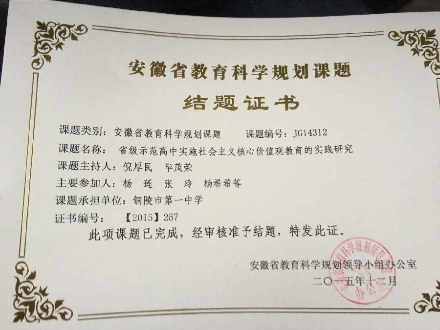 我校承担的安徽省教育科学规划课题,通过课题组成员长时间的研究和探索,顺利通过专家组评审鉴定,如期结题。课题由倪厚民,毕茂荣老师主持,杨莲,张玲,杨希希等老师参与承担的。课题研究提高了课题组教师运用各种教学手段的能力,科研意识,业务素养也在实践中得以提升。