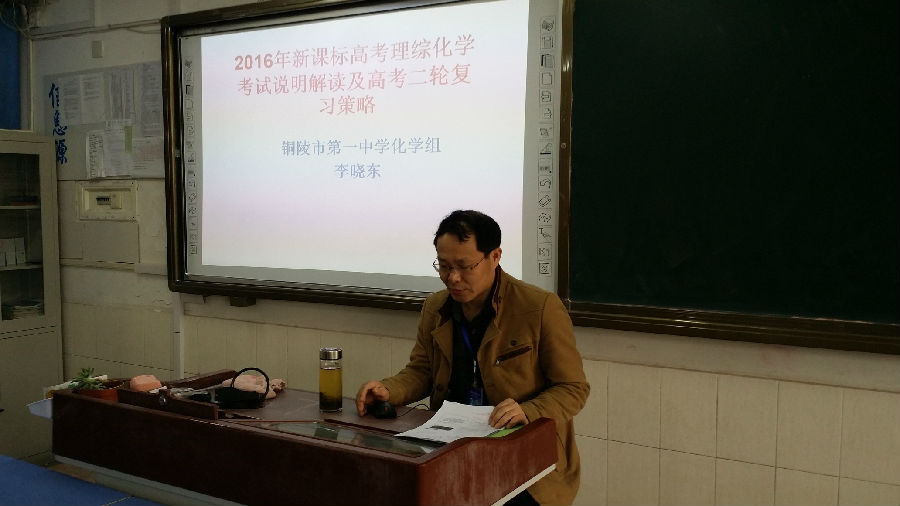 在化学学科分会场,国家优质课课堂教学大赛二等奖、 安徽省化学优质课课堂教学大赛一等奖获得者,我校化学高级教师李晓东应邀作了“2016年新课标高考理综化学考试说明解读及高考二轮复习策略”主题发言,他深入解析了2016年高考“考试大纲”“考试大纲说明”化学部分,并以详实的数据、清晰的脉络、典型的实例、相似的例题和高考真题对比给人以耳目一新的感觉。