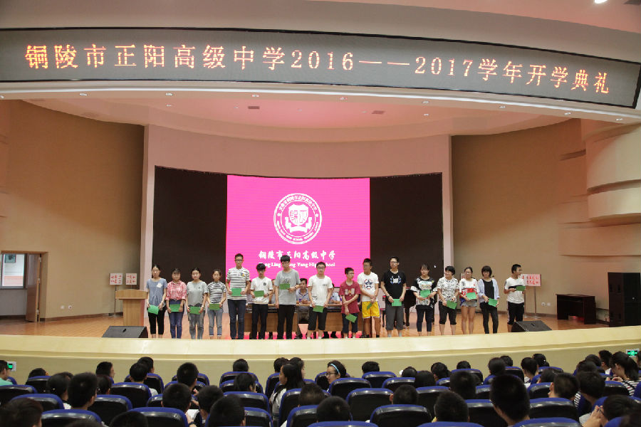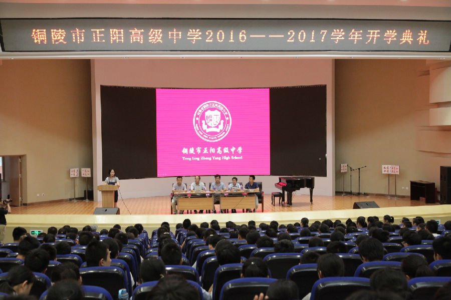 9月 5日下午,在铜陵市一中学苑校区报告厅举行了2016-2017学年度第一学期开学典礼,参加会议的领导有一中刘源泉副校长,教务处吴智主任,正阳中学王力校长,吴宗飞副校长,杨平副校长等,高一高二全体学生,班主任和行政教辅人员。