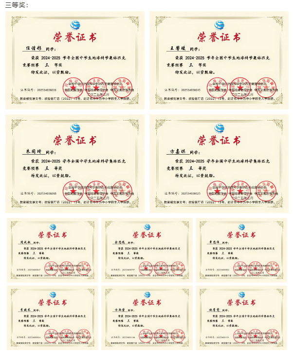 在刚刚结束的2025年全国中学生地球科学奥林匹克竞赛中,作为首次参赛的新生力量,铜陵一中高一学子凭借扎实的地理功底、敏锐的科学思维和勇于挑战的精神,在全省舞台上崭露头角,共14名同学获奖,其中省一等奖3人,省二等奖1人,省三等奖10人。