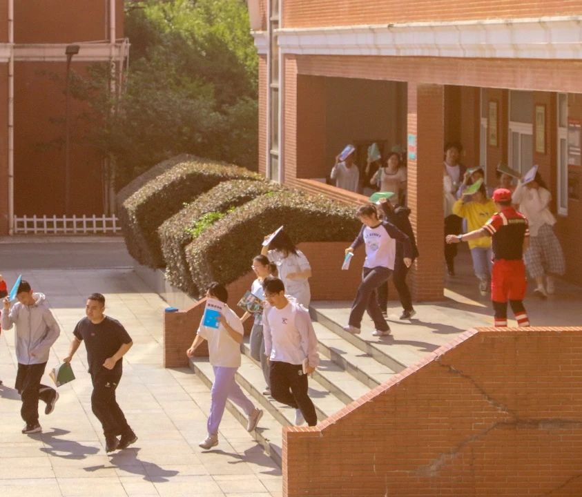 随着警报声响起,全校师生迅速进入状态。教学楼内,全校师生按照“低楼层先行、就近路线撤离”原则,分区域、分楼层沿指定通道快速疏散;图书馆、实验楼、美育中心等场所同步响应,师生在引导下有序集结至运动场、科技楼广场等安全区域。整个过程无拥挤、推搡现象,师生动作规范、配合默契,充分展现日常安全教育的扎实成效。