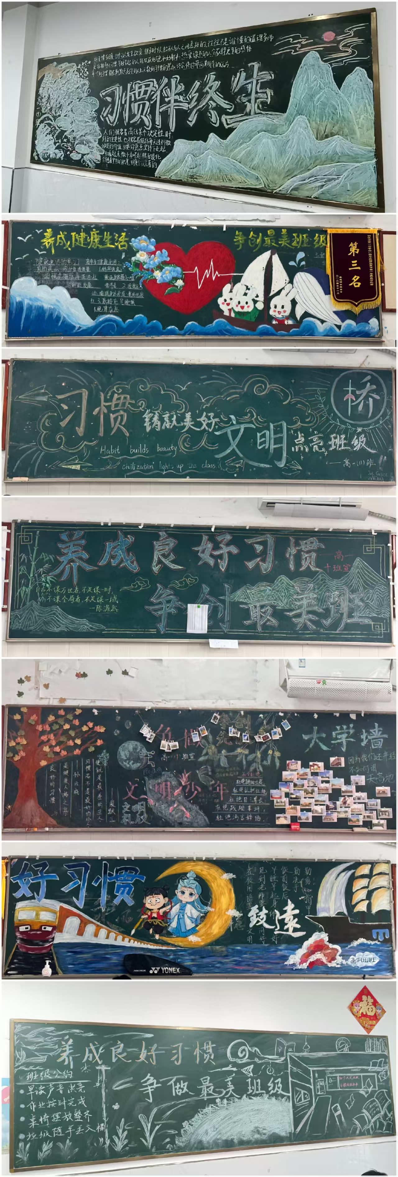 近日,作为学校深入推进行为习惯养成教育系列活动的重要篇章,“养成良好习惯,争创最美班级”主题黑板报活动正式亮相于各班教室后方那片充满灵感的方寸天地。各班同学倾注热忱,以粉笔为犁,以智慧为种,深耕于这方独特的育人沃土。