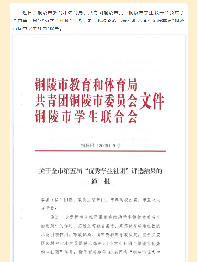 五育融合 | 铜陵一中两学生社团荣获全市第五届“优秀学生社团”称号