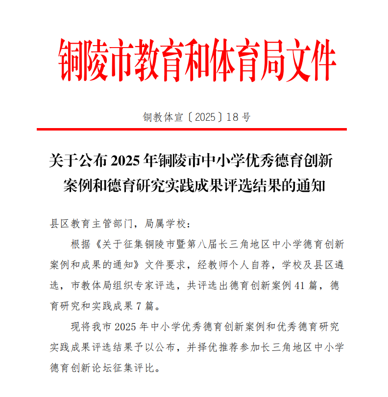 近日,2025年铜陵市中小学优秀德育创新案例和德育研究实践成果评选结果揭晓。我校斩获多项殊荣,其中,夏冰、梅宇老师的德育创新案例《家校协同视域下高中生家长教育能力提升路径探索》和吴宗飞老师的德育研究实践成果《深耕本土资源,提升德育亲和力与实效性》双双获得市级一等奖,并推荐参加长三角评比。