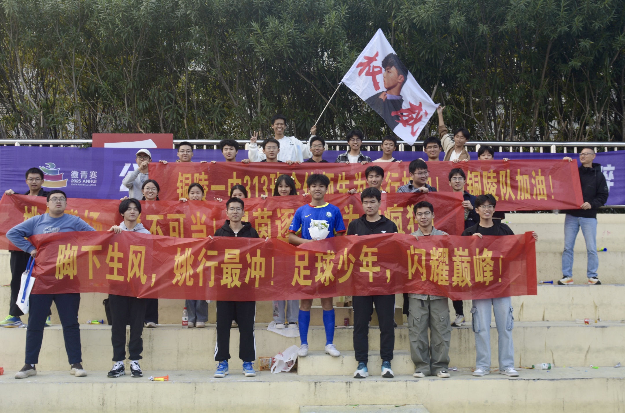 赛场边的氛围同样热烈非凡。姚行的班主任樊爱绪老师及同班同学们自发组织了50余人的助威团,提前到场制作了多张“姚行加油!铜陵必胜!”的彩色助威横幅,老师及同学们用最真挚的热情为姚行和班级荣誉呐喊助威。这份来自同窗的坚定支持,成为球员们在场上奋力拼搏的重要动力,也让赛场充满了青春的凝聚力与归属感。