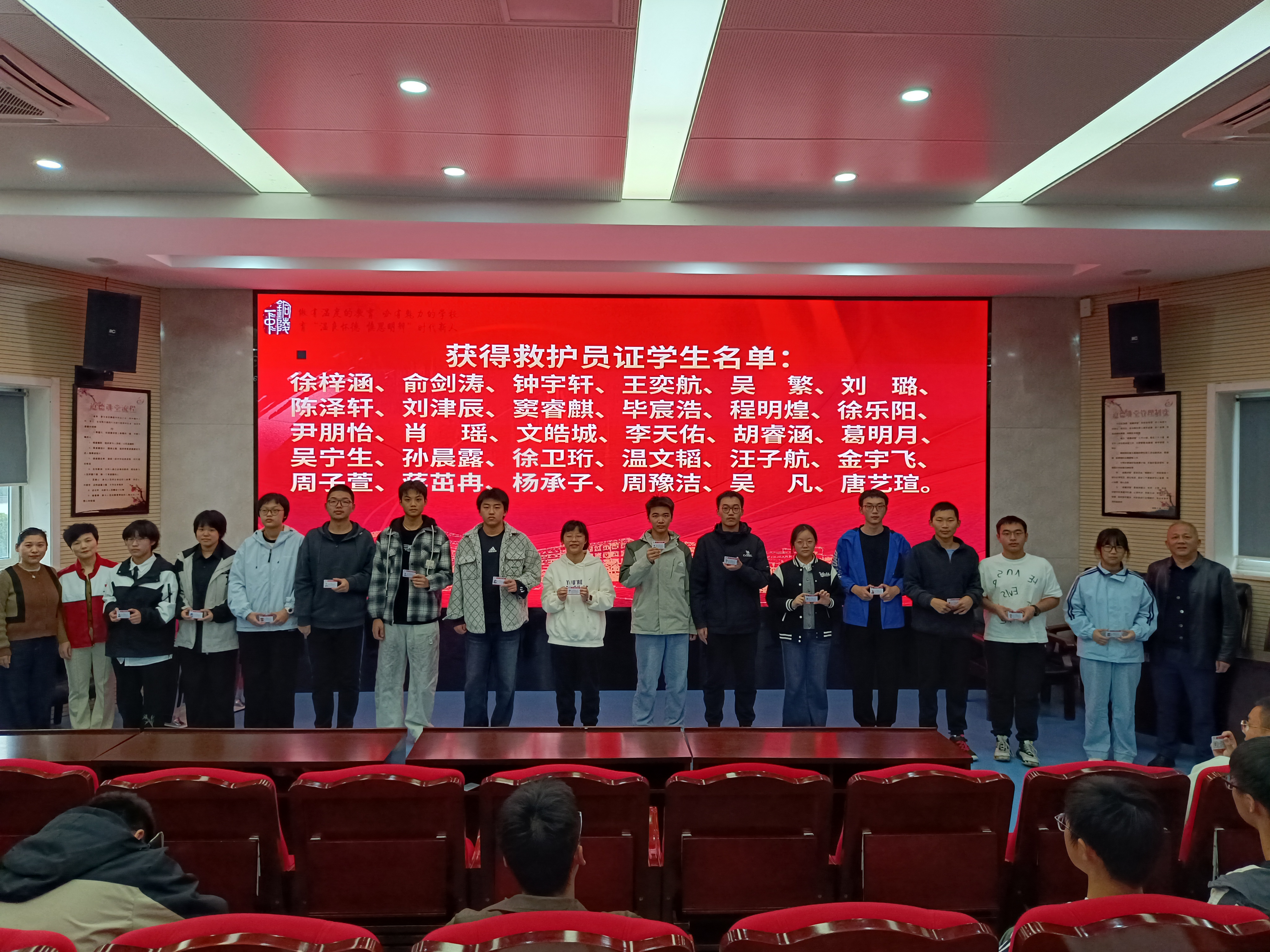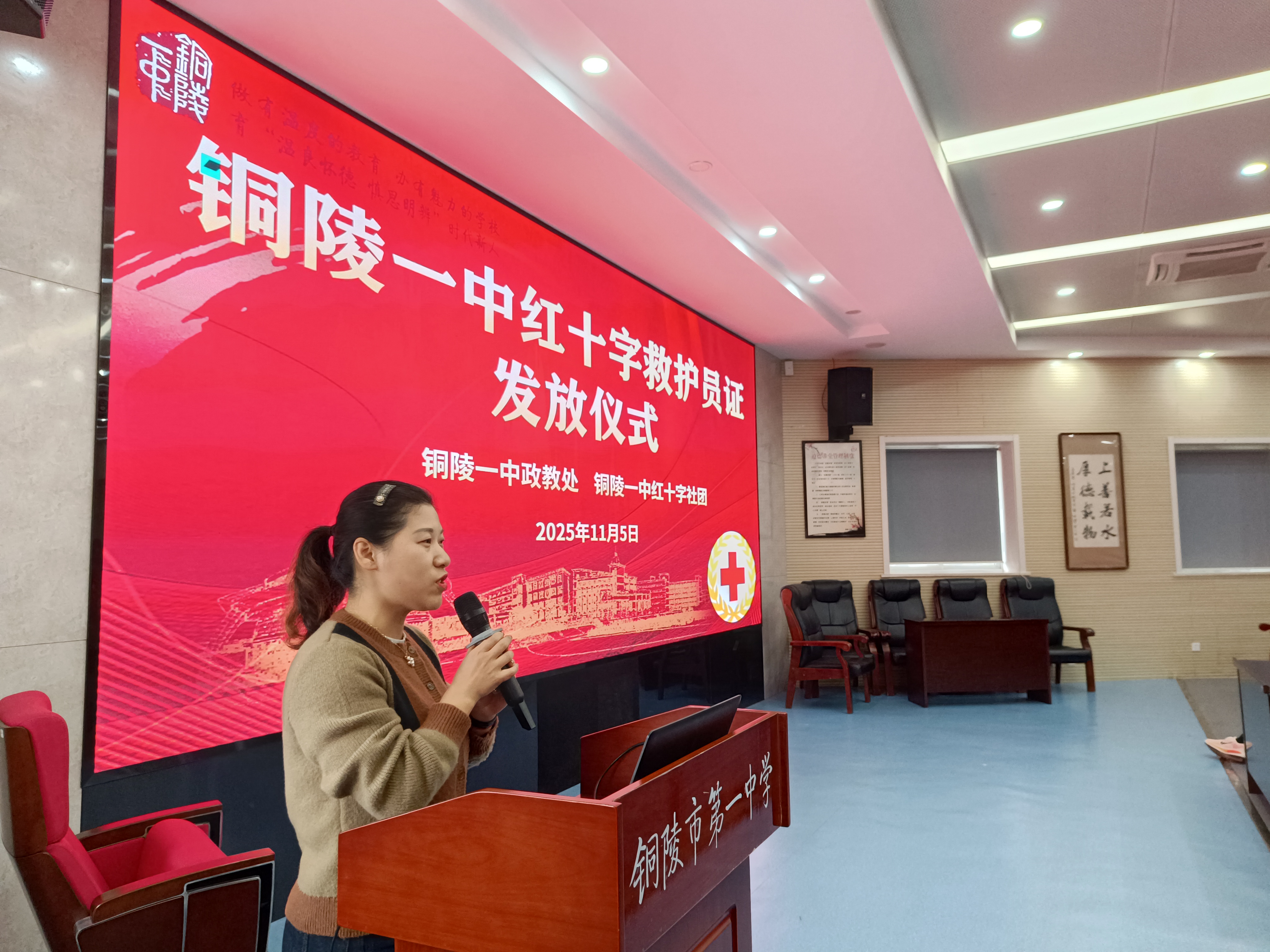 为进一步提升学生自我保护能力和应急救护能力,筑牢校园安全防线,11月5日下午,我校在阶梯教室举行中学红十字救护员证颁证仪式。校党委书记汪小平出席仪式,相关部门负责人、铜陵一中红十字社团指导教师、市红十字会会员周克莲,班主任代表及获得救护员证的学生参加活动。