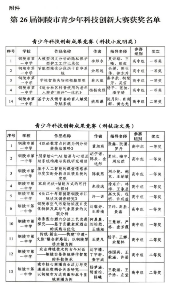 本次大赛我校一等奖项目涵盖小发明制作4项、科技论文7项,其中10项成功晋级省赛,一等奖与晋级省赛数量均位列全市第一,创下学校历史最好成绩,充分展现了一中学子的创新风采与科技实力。优异成绩的取得,是学校长期重视科技创新教育、优化育人环境的成果,彰显了我校在培养学生科学素养、创新精神与实践能力方面的扎实成效。近年来,学校坚持五育并举,搭建多元发展平台,鼓励学生大胆探索创新,培育了一批批优秀科创后备人才。下一步,铜陵一中将全力支持晋级学子备战省赛,进一步整合资源、加强科创师资建设、完善拔尖创新人才培养机制,为全市青少年科技教育高质量发展贡献更大力量。