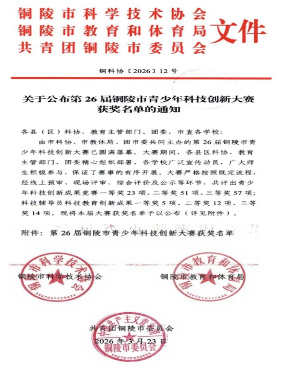 在刚刚落幕的第二十六届铜陵市青少年科技创新大赛中,铜陵一中学子凭借出色的创新能力和扎实的科研素养,斩获11项一等奖、4项二等奖,一等奖人数及晋级省赛项目数双双刷新历史。